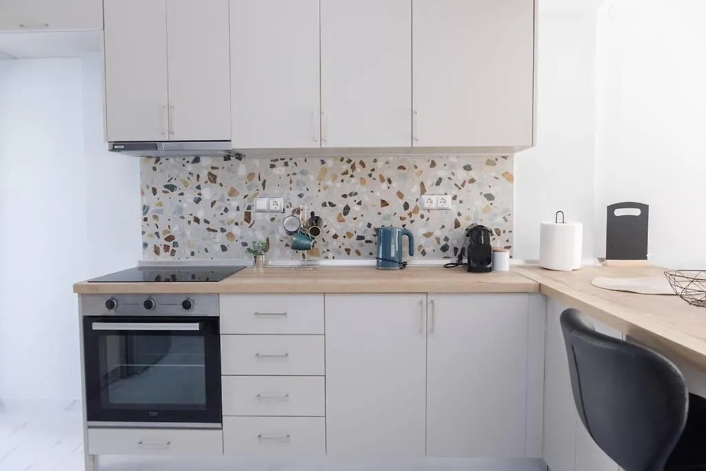 L'appartamento è dotato di servizi per la preparazione di tè/caffè e di una cucina completamente attrezzata con un bollitore elettrico, un frigo e un forno.
